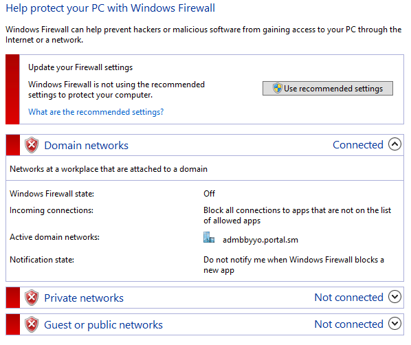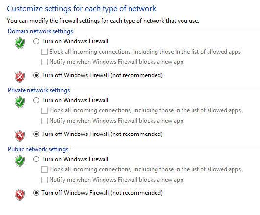 4. Check all options with Turn off Windows Firewall (not recommended)