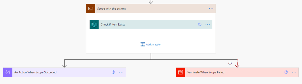 Esto significa que además de la razón visual, el Scope tambien nos dara un resultado dependiendo de si sus acciones son ejecutadas correctamente o tenemos un error. En ocasiones ese error no es mas que algo que esperamos (por ejemplo, si hacemos una llamada para comprobar si un elemento existe y por defecto devuelve un error si no es así). De este modo podemos configurar la acción siguiente a ejecutarse cuando el Scope sea «Successful» y crear una acción paralela a ejecutarse cuando el Scope sea «Failed», sin necesidad de utilizar un control de Condition.