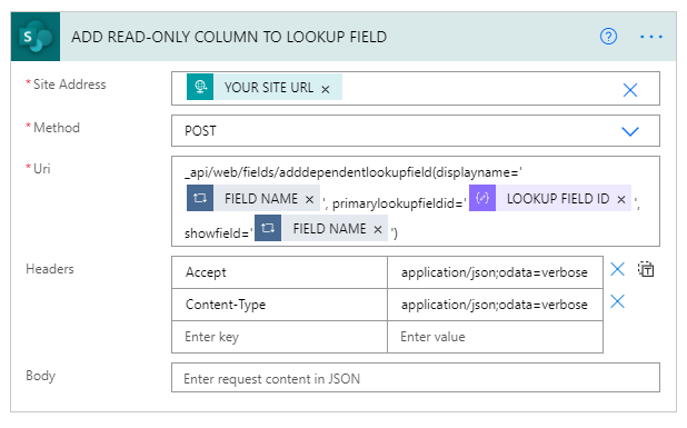 _api/web/fields/adddependentlookupfield(displayname='FIELD NAME', primarylookupfieldid='LOOKUP FIELD ID', showfield='FIELD NAME')